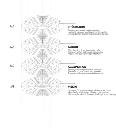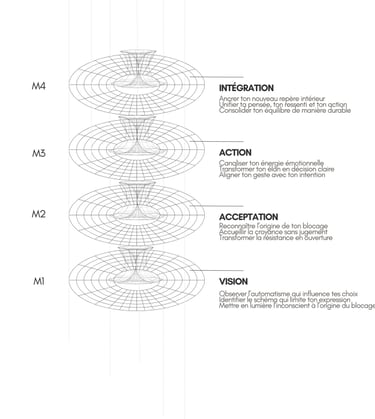 Une méthode structurée qui agit sur vos fondations internes pour réorganiser votre manière de penser, de ressentir et d’agir — durablement.