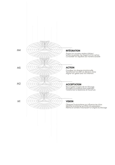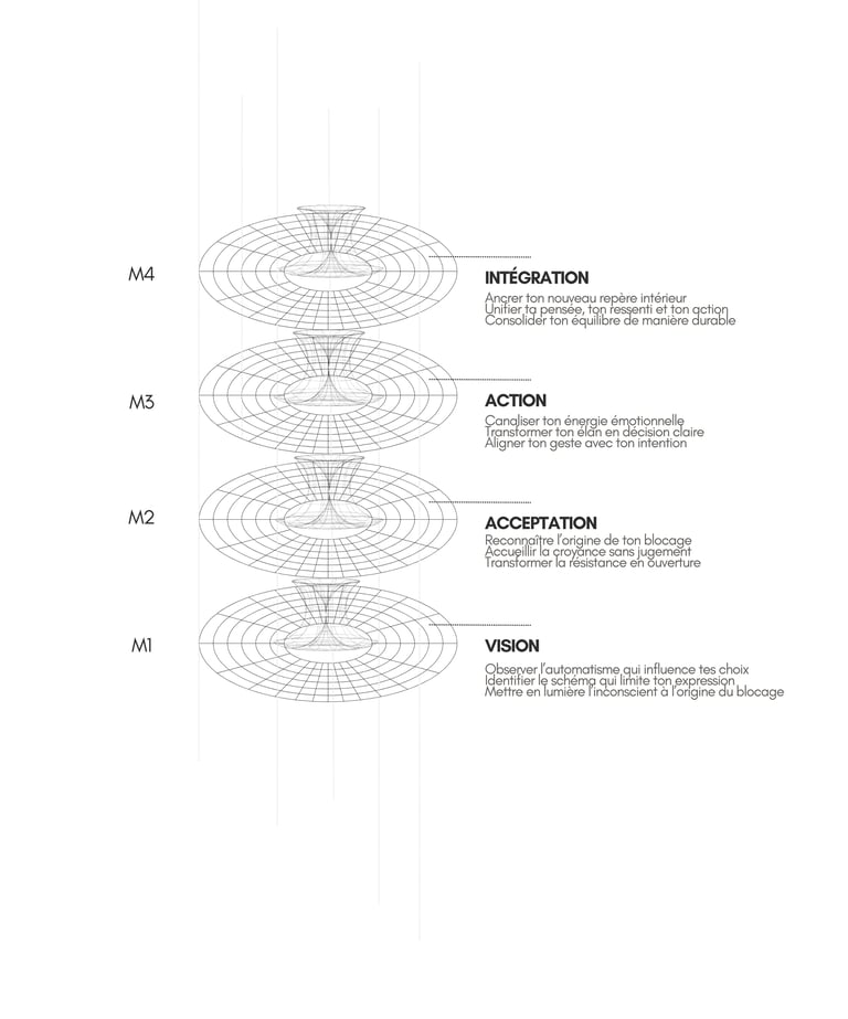 Les contenus structurés de chaque module avec leurs points clés, indicateurs et repères pour suivre ton évolution en conscience.