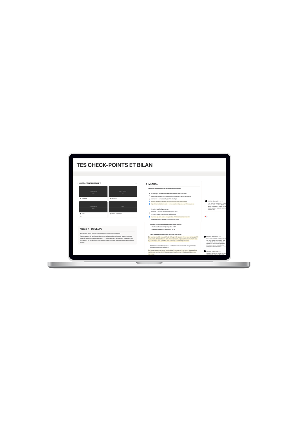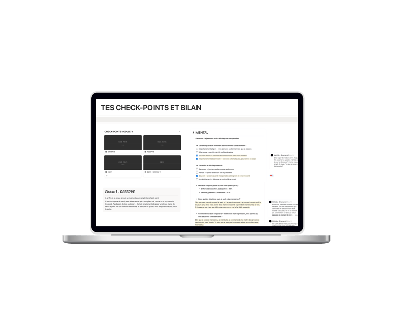 Entre les sessions, tu avances dans l’espace Notion du programme, qui rassemble les contenus, les pratiques et tes check-points personnels. Chaque semaine, tu complètes ton check-point et je te réponds directement, afin d’accompagner ton évolution, ajuster le travail et soutenir ton processus tout au long de la capsule.