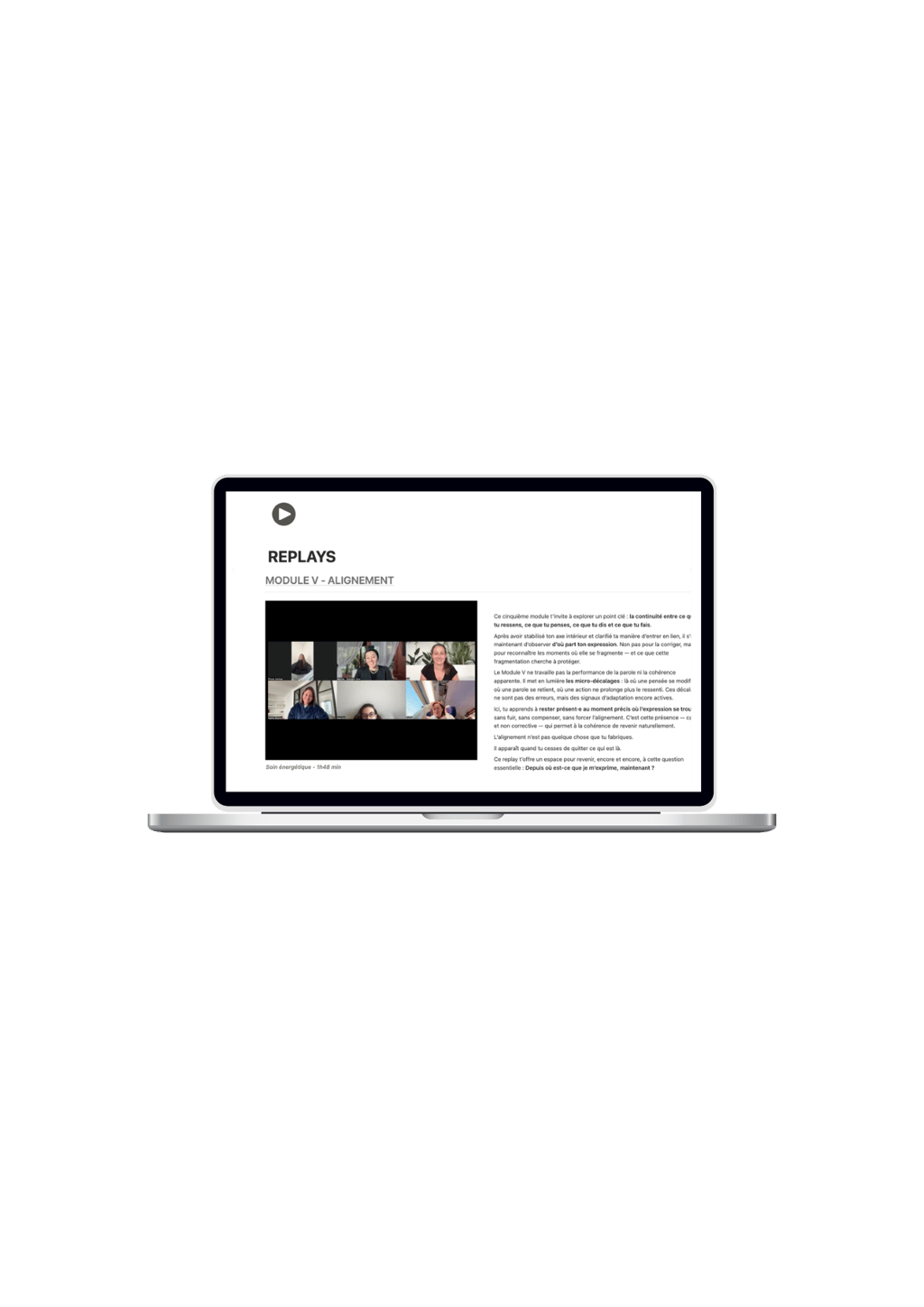 Chaque module commence par une session collective en direct pour comprendre les enjeux du module, poser tes questions et activer le processus de transformation.