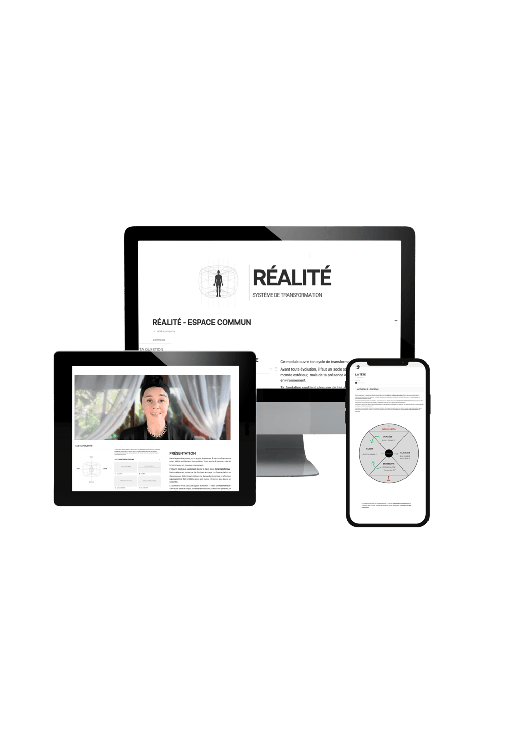 RÉALITÉ fonctionne différemment. Le système agit simultanément sur les quatre espaces fondamentaux — corps, esprit, émotions et énergie — dans un cadre structuré qui combine compréhension, outils concrets, pratiques ciblées et suivi personnalisé. Chaque élément du programme est conçu pour soutenir et intégrer ton évolution en profondeur.