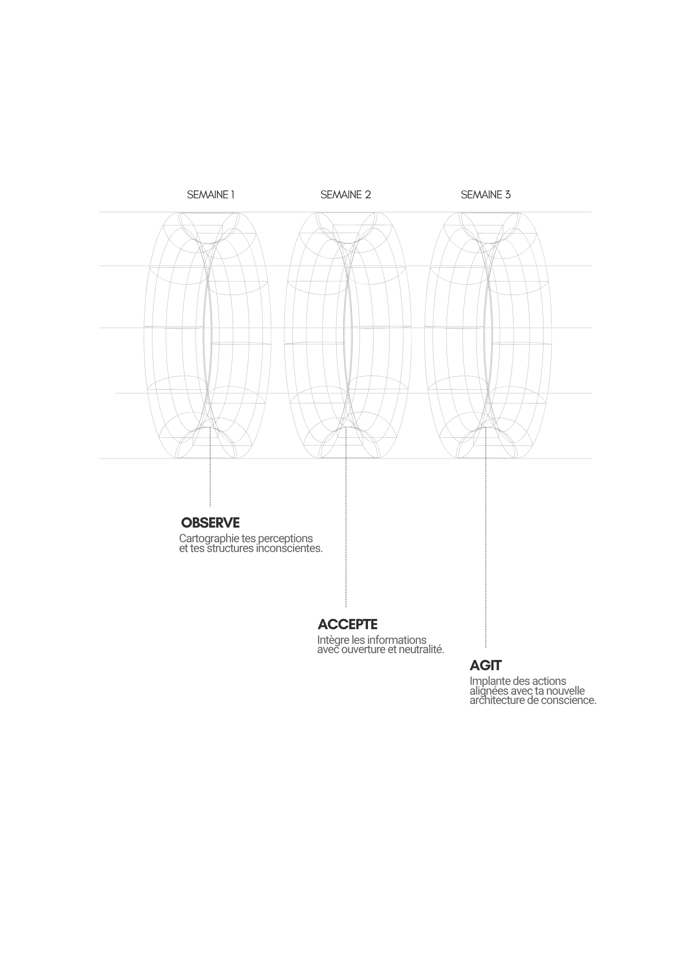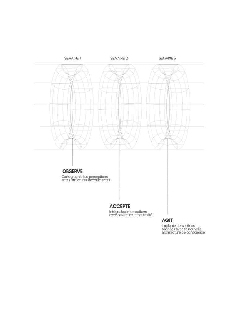 Dans chaque module, tu traverses trois phases : Observer, Accepter, Agir. Un mouvement simple pour voir ce qui pilote en dessous — puis agir autrement.
