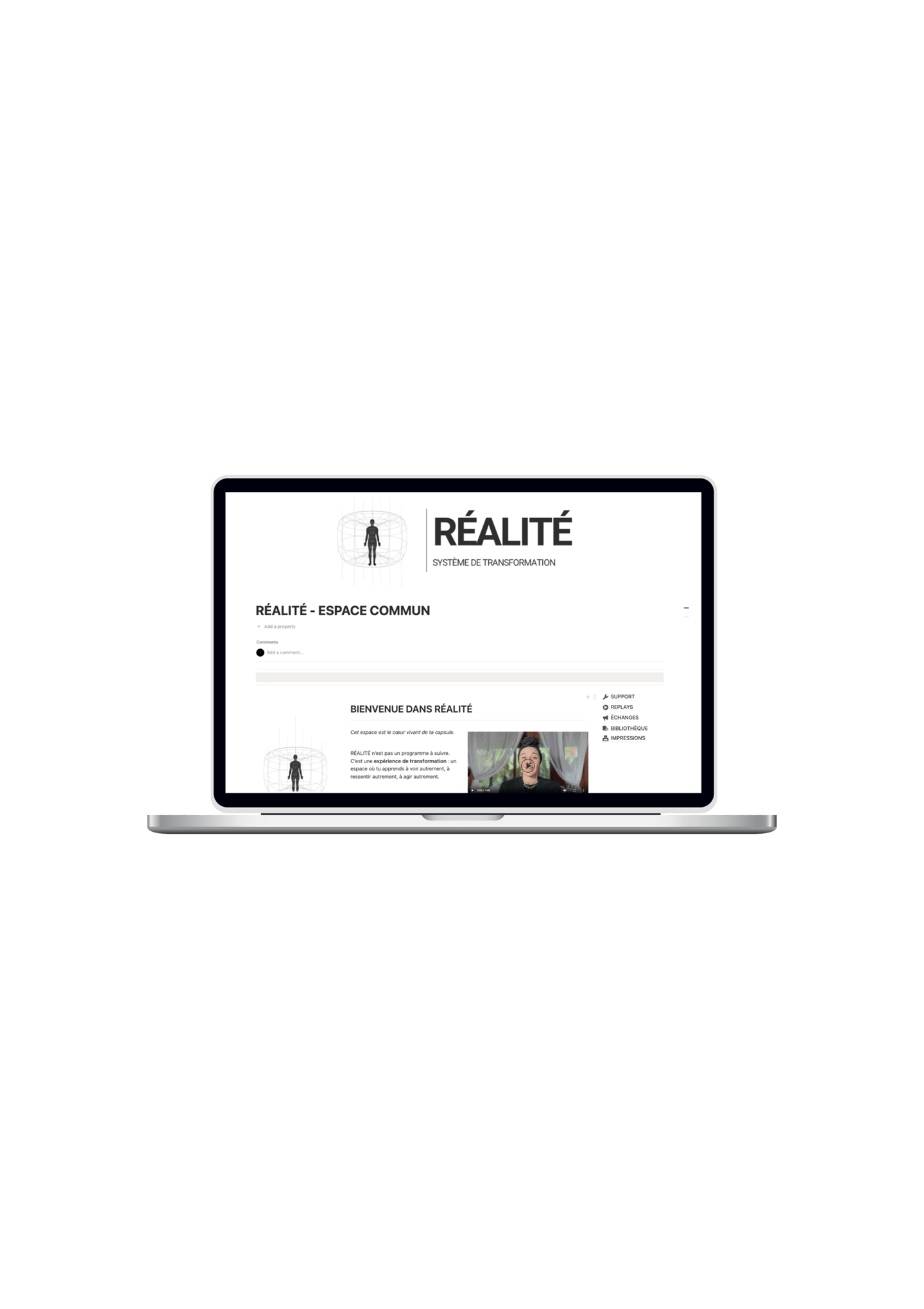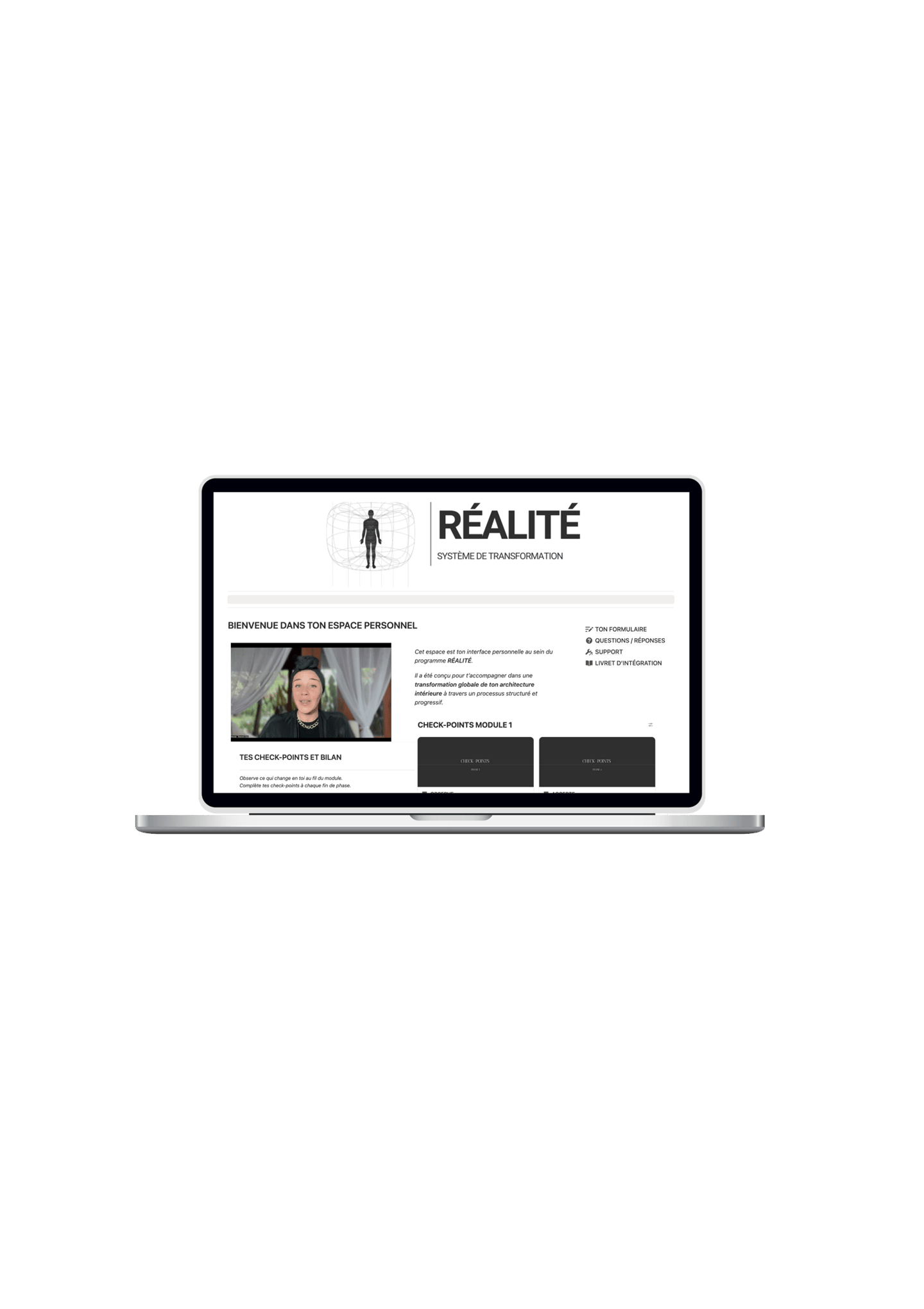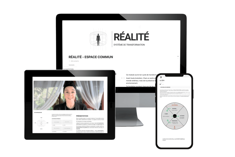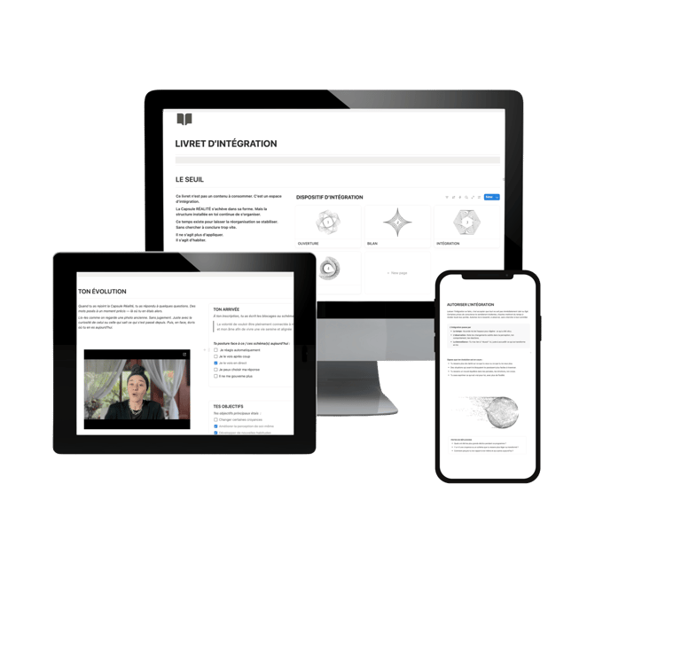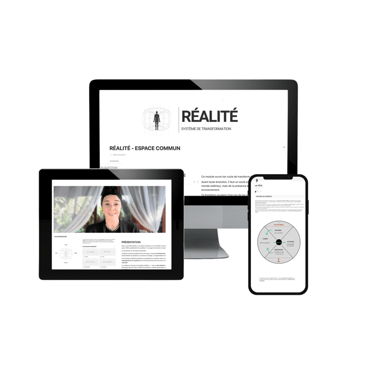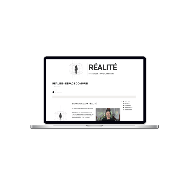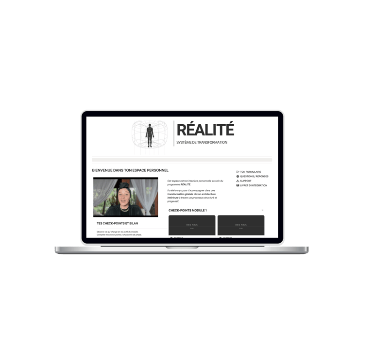 Mais surtout : le cœur du travail ne dépend pas des sessions live. RÉALITÉ est conçu comme un système structuré qui te permet d’avancer de manière autonome. Chaque module contient les enseignements, les marqueurs, les pratiques et les routines nécessaires pour transformer ton système intérieur. Tout est centralisé dans ton espace Notion : tu peux suivre les modules, intégrer les pratiques et progresser à ton rythme.