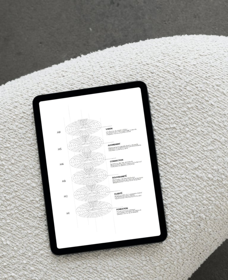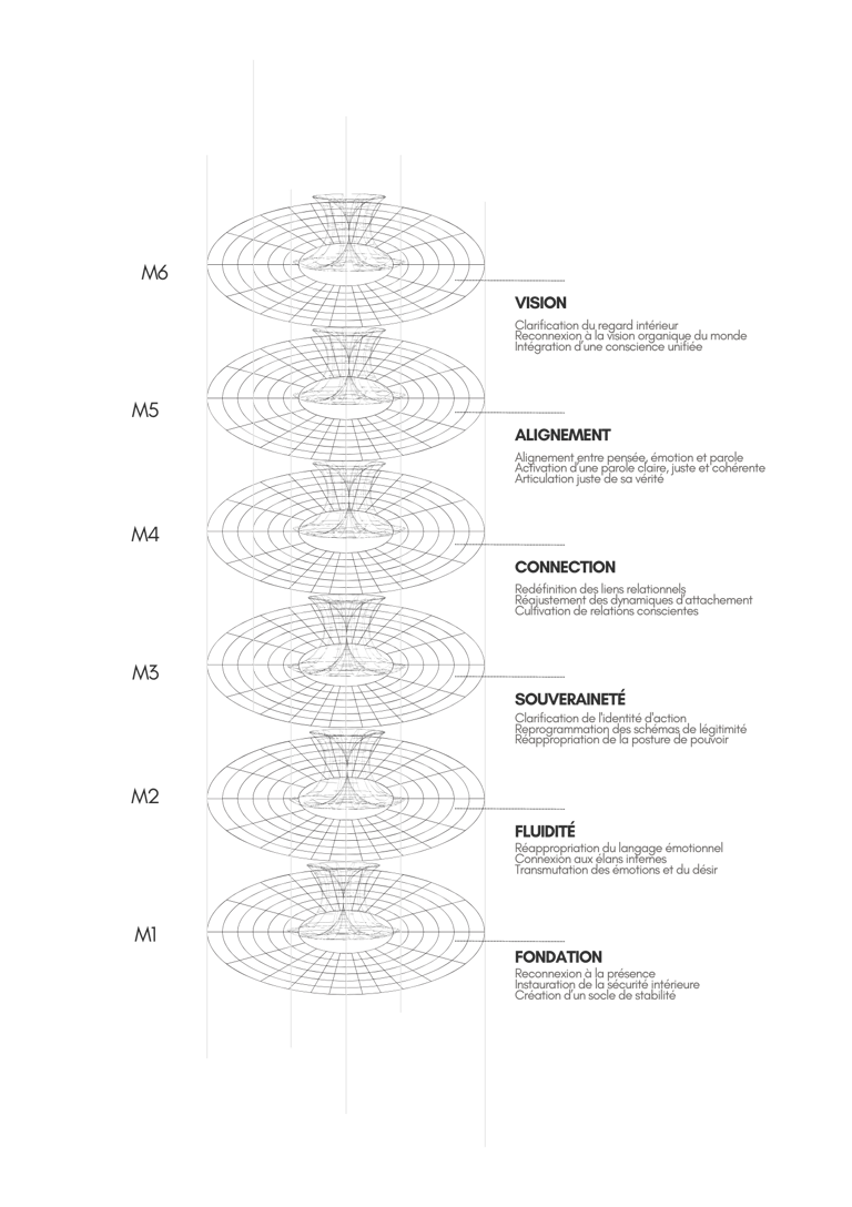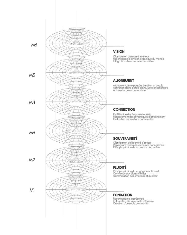 Ce que j’ai découvert, c’est que le problème n’était pas la profondeur du travail — mais l’absence d’architecture. Alors j’ai arrêté de chercher un outil de plus et j’ai commencé à cartographier. Observer comment le corps, le mental, l’émotion et l’énergie interagissent. Modéliser les cycles d’effondrement. Tester différentes configurations. Pour garder ce qui transforme réellement. Petit à petit, une architecture vivante a pris forme....