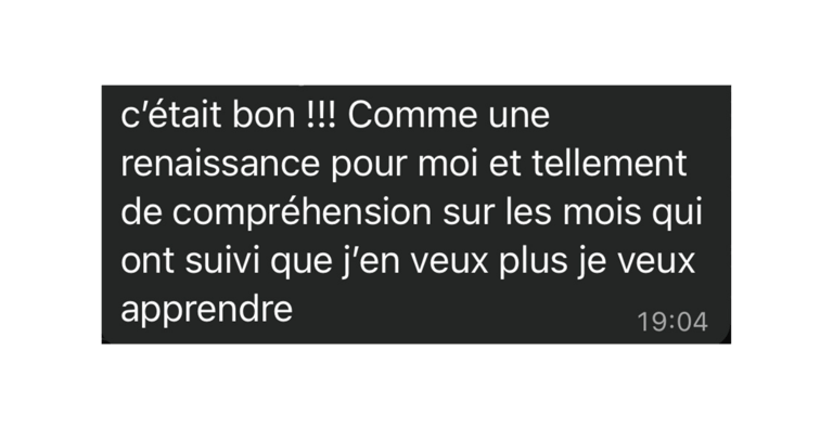 Un mois après le dernier module, nous nous retrouvons pour une session collective d’intégration afin de faire le point sur ce qui a évolué et d’ancrer les transformations. Tu reçois également un livret d’intégration personnalisé qui synthétise ton parcours et t’aide à poursuivre le travail.