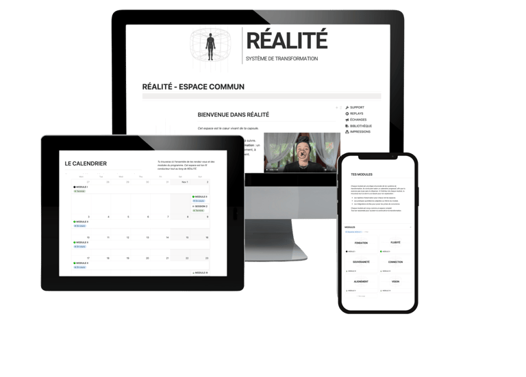 RÉALITÉ se déroule sur 6 mois. Le parcours est structuré en 6 modules, avec un nouveau module toutes les 3 semaines et une session collective en direct pour accompagner chaque étape.