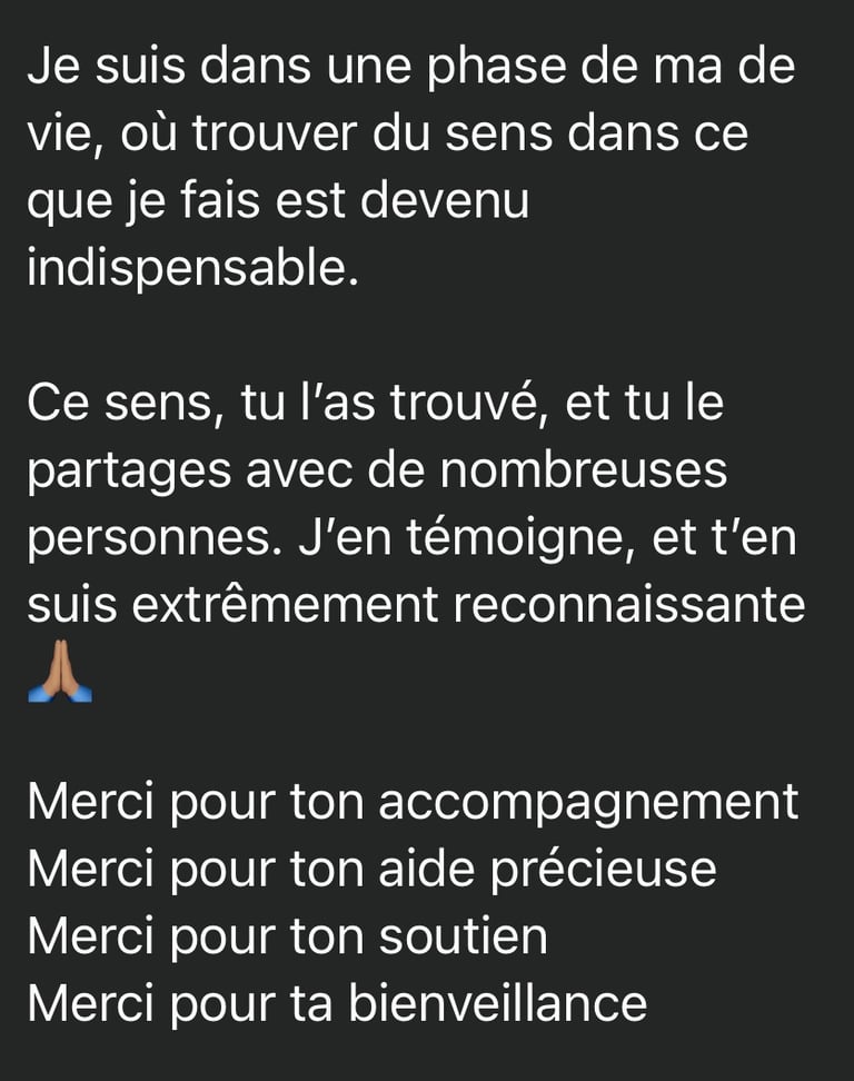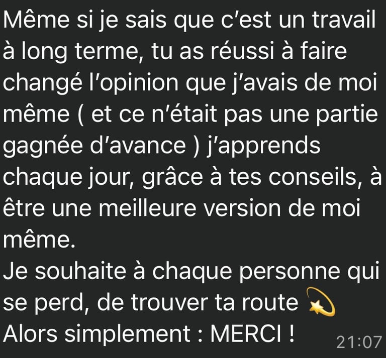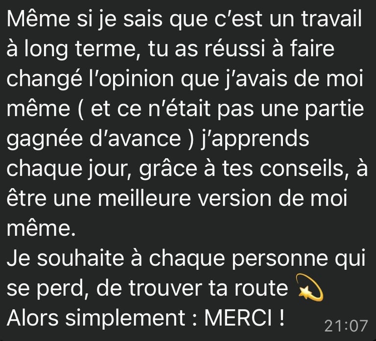 L’efficacité du travail repose cependant sur un principe simple : l’engagement mutuel. Je mets à ta disposition une structure claire, des outils précis et un accompagnement attentif. La profondeur des résultats dépend ensuite de l’implication de chacun dans le processus.